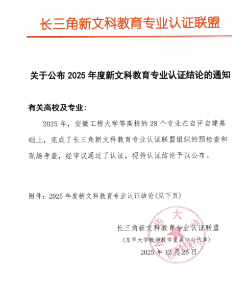12月26日,长三角新文科教育专业认证联盟发布《关于公布2025年度新文科教育专业认证结论的通知》,大发体育官网_大发888体育-中国体彩网彩票推荐工商管理专业顺利通过认证(有条件),有效期自2026年1月至2029年12月,成为大发体育官网_大发888体育-中国体彩网彩票推荐继财务管理专业后第二个通过长三角新文科教育专业认证的专业。