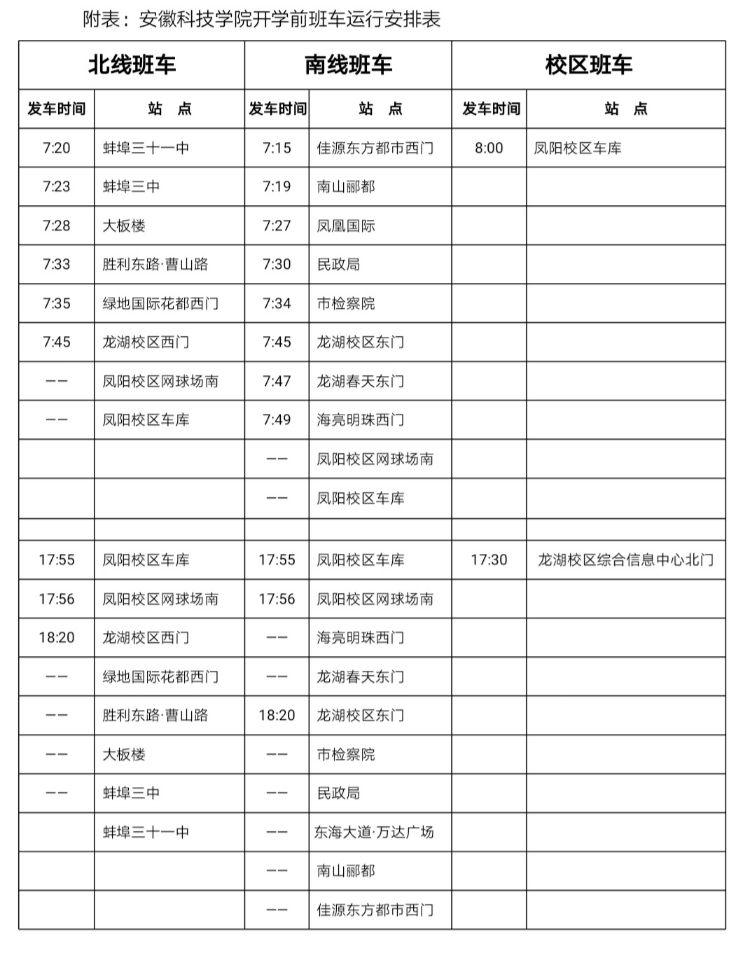 2、8月20-30日(含周六、周日),南、北线班车和校区班车运行,具体站点和时间见《大发体育官网_大发888体育-中国体彩网彩票推荐科技学院开学前班车运行安排表》。