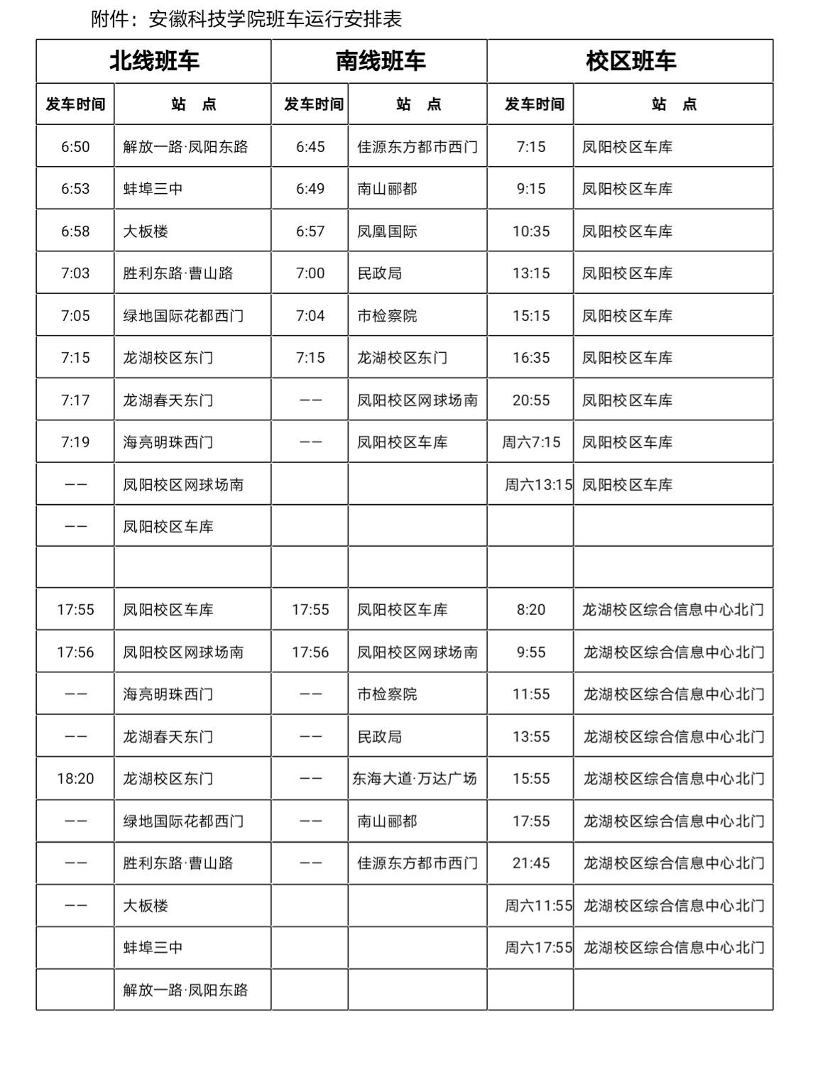 二、自8月30日起,南、北线和校区班车按《班车运行安排表》正常运行。