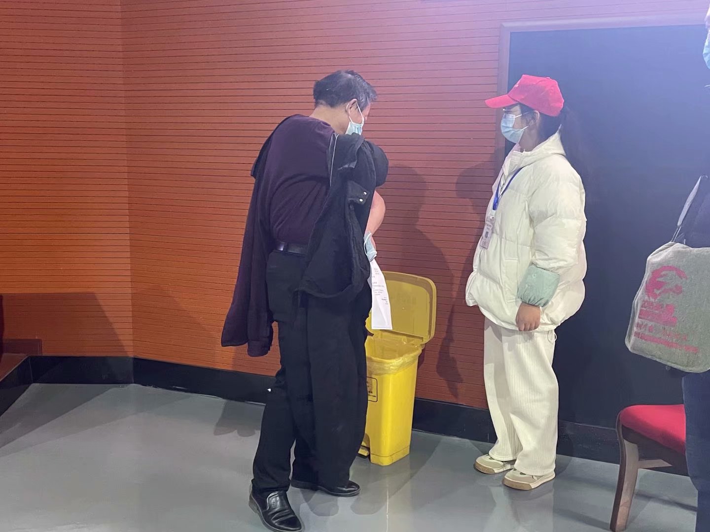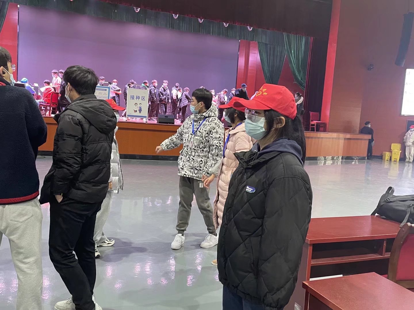 在大学生活动中心会场里,可以看到一顶顶小红帽佩戴工作证和口罩,维护秩序、为同学们指路、引导已注射的人员将棉签扔进专用垃圾桶内等等。