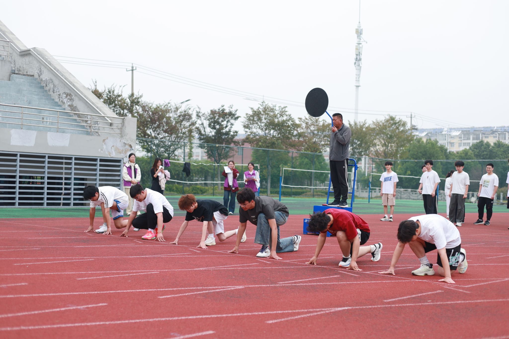 清爽秋风拂去燥热,却吹不熄运动健儿胸中燃烧的斗志。本次运动会共有20个班级共130名同学参加,分为田赛、径赛和趣味运动赛。跳高横杆前,他们如矫健的雄鹰腾空而起,在凉风中划出优美的弧线;跳远沙坑旁,他们似离弦的箭镞纵身一跃,在松软沙粒上镌刻拼搏的印记;铅球落地处,他们以浑厚的力量掷出希望,在泥土飞溅中绽放青春的锋芒;操场跑道上,短跑健儿如风掠过,长跑勇士似山坚毅,以脚步丈量热血的疆域。