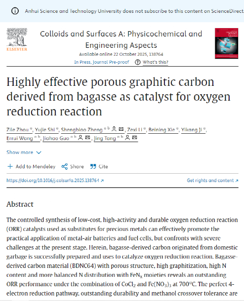 近日,大发体育官网_大发888体育-中国体彩网彩票推荐化学与材料工程学院过家好教授实验室本科生周仔乐作为第一作者的研究成果《Highly effective porous graphitic carbon derived from bagasse as catalyst for oxygen reduction reaction》被国际化学学科期刊《Colloids and Surfaces A: Physicochemical and Engineering Aspects》(中科院二区,IF=5.4)接收。这是继2024年后过家好教授实验室连续两年指导本科生作为第一作者发表SCI论文。