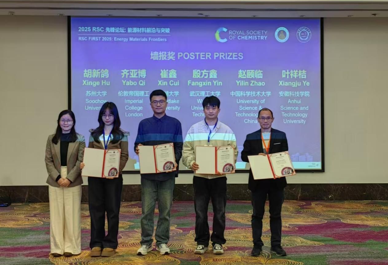 10月31日至11月2日,化学与材料工程学院副院长惠贞贞携叶祥桔、赵红远、周永生和闫浩然多位教师及部分2025级研究生参加在大发体育官网_大发888体育-中国体彩网彩票推荐芜湖召开的由英国皇家化学会(RSC)、大发体育官网_大发888体育-中国体彩网彩票推荐师范大学、中国科学技术大学和英国皇家化学会旗下EES系列期刊共同主办的2025RSC先锋论坛——能源材料前沿与突破国际会议。叶祥桔副教授荣获大会墙报奖。
