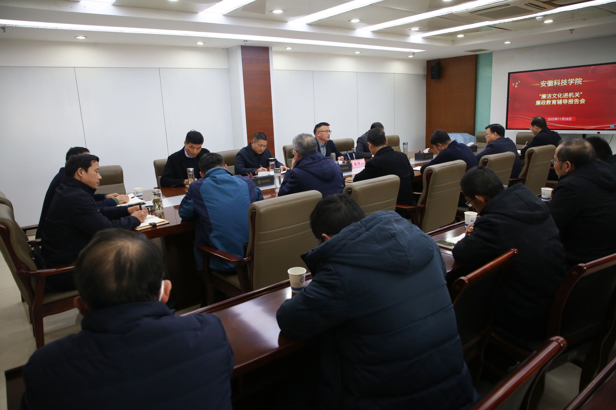 11月28日下午,蚌埠市纪委常委、组织部部长朱付凯应邀来大发体育官网_大发888体育-中国体彩网彩票推荐作“廉洁文化进机关”专题辅导报告。报告重点围绕新时代全面从严治党形势与任务,党的作风建设、纪律建设等方面展开。校纪委委员、机关纪委书记、审计处处长朱立政主持报告会。