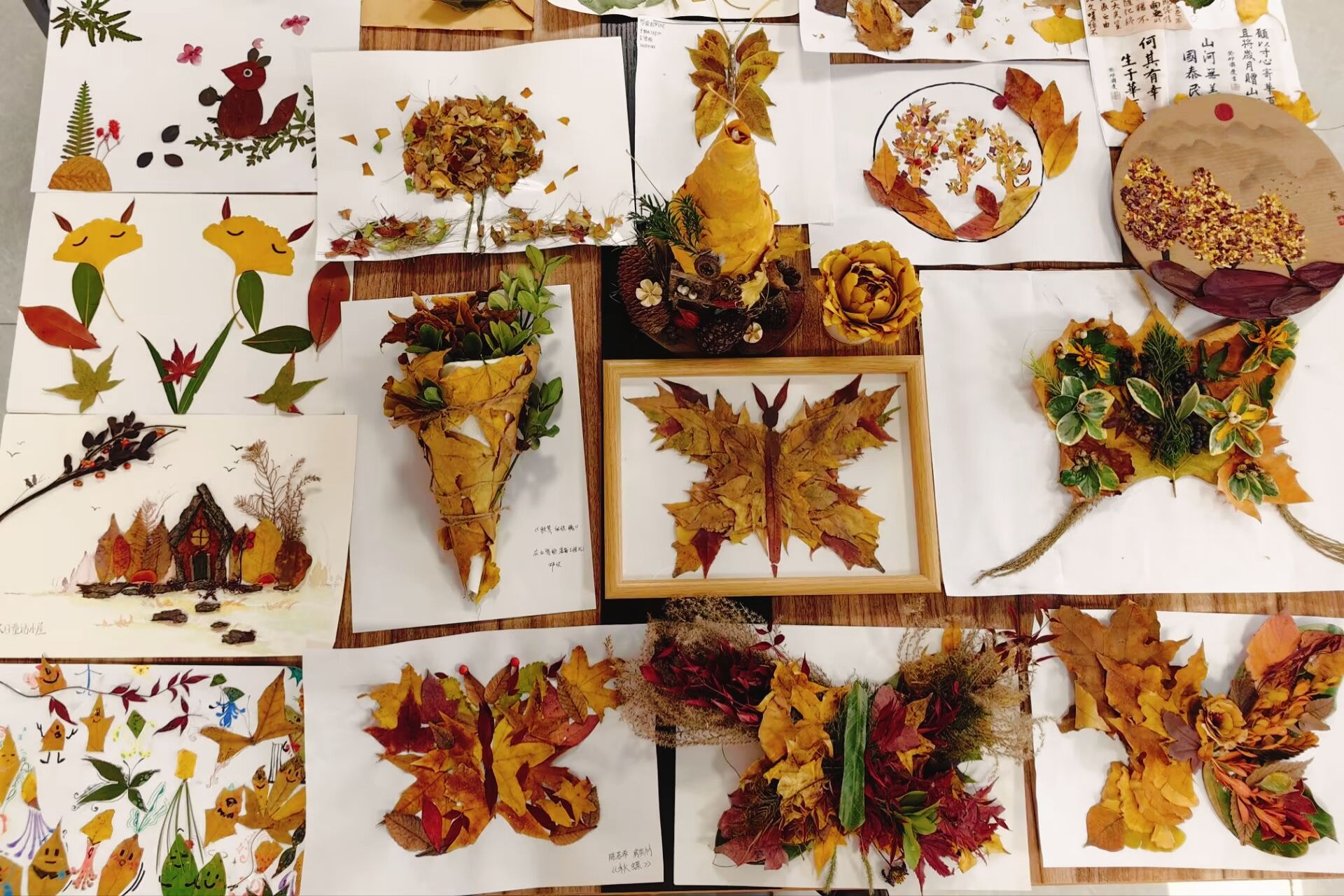 本次比赛以秋冬自然元素为创作载体,让同学们在手工创作中感受自然之美、释放内心情绪,为心理健康教育搭建了充满趣味的实践平台。参赛同学们化身“收藏家”,纷纷走出教室、走进校园角落,捡拾形态各异的秋叶、干枯树枝、松果等自然素材,并结合自身所学专业,将自然的斑斓与诗意用天马行空的创意“跃然纸上”,每一件作品都承载着创作者对秋冬的独特理解,也蕴含着对内心情绪的细腻表达。