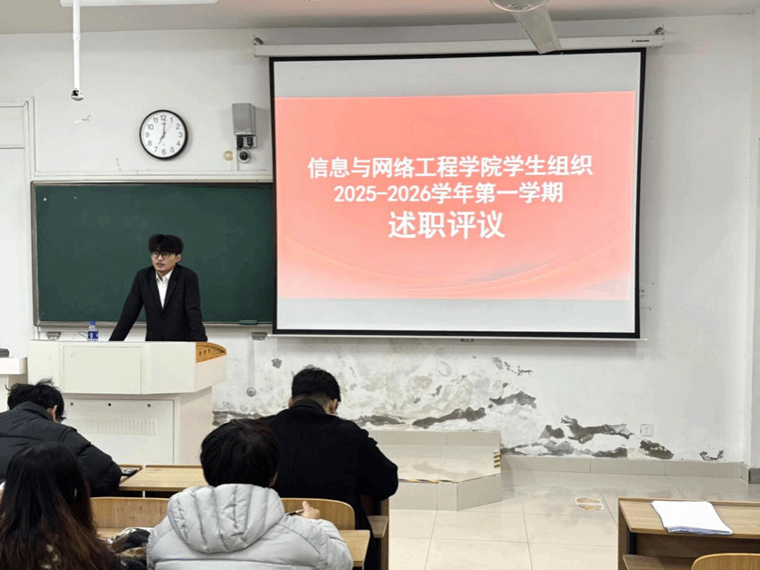 为全面总结学期工作成效,12月24日晚,信息与网络工程学院学生会在致知楼C208召开2025-2026学年第一学期述职评议会。学生会指导老师崔北坤、校学生会主席胡天宇及院学生会全体成员出席本次会议,会议由学院主席团成员崔振东主持。