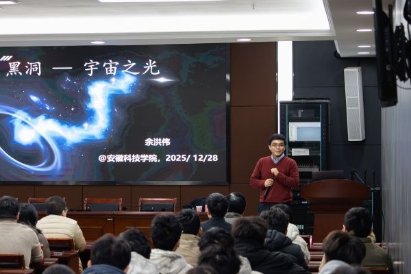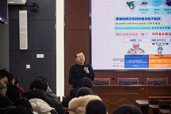 随后的两场报告聚焦于物理学前沿领域。湖南师范大学余洪伟教授以《黑洞—宇宙之光》为题,为在场师生带来了一场内容丰富的学术报告。他从伽利略、牛顿到爱因斯坦的科学探索历程入手,系统回顾了人类对引力认知的演进过程,并聚焦于黑洞这一宇宙神秘现象,介绍了人类如何通过“感知”“凝视”“聆听”等多种科学手段逐步揭开其神秘面纱。报告梳理了相关领域的理论发展脉络,兼具历史纵深与前沿视野,生动展现了一段人类不断追问自然、探索未知的科学征程。国科大杭州高等研究院加拿大籍专家耿朝强教授带来了一场题为《探寻量子—宇宙物理之美》的学术报告。他从占宇宙成分5%的已知物质与相互作用出发,逐步延伸到物质是否无限可分、自然界对称性之美等深刻命题,并简要介绍了暗物质、暗能量、引力波与黑洞等前沿领域。报告贯通微观量子世界与宏观宇宙结构,生动展示了物理学在探索自然根本规律中的简洁与和谐。两场报告深入浅出,激发了在座研究生、本科生及教师代表对物理学前沿的浓厚兴趣。