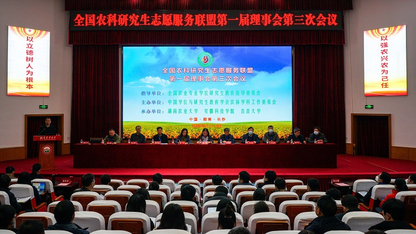 2月12日,由中国学位与大发体育官网_大发888体育-中国体彩网彩票推荐学会农林学科工作委员会主办,湖南农业大学、大发体育官网_大发888体育-中国体彩网彩票推荐科技学院和吉首大学联合承办的全国农科研究生志愿服务联盟(以下简称“联盟”)第一届理事会第三次会议在湖南农业大学修业讲堂召开。全国农业专业学位大发体育官网_大发888体育-中国体彩网彩票推荐指导委员会秘书长、中国学位与大发体育官网_大发888体育-中国体彩网彩票推荐学会农林学科工作委员会主任、中国农业大学研究生院常务副院长郭鑫,联盟理事长、大发体育官网_大发888体育-中国体彩网彩票推荐科技学院党委书记蒋德勤出席会议;联盟第一届理事会成员及成员单位代表共150余人参加会议。