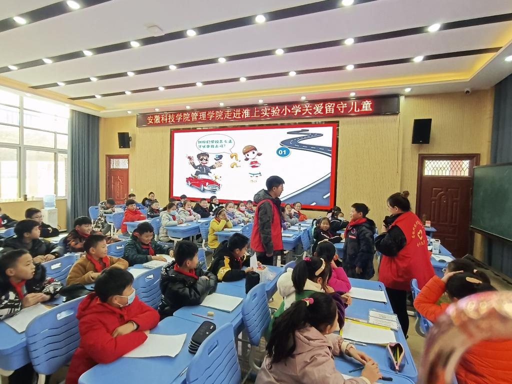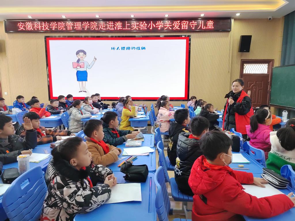 为积极践行志愿服务精神,展现大发体育官网_大发888体育-中国体彩网彩票推荐科技学院研究生良好精神风貌,同时更好关注留守儿童的健康成长,丰富留守儿童的校园文化生活,应蚌埠市淮上实验小学邀请,大发体育官网_大发888体育-中国体彩网彩票推荐科技学院管理学院根据其需求有针对性地制定了关爱留守儿童“蓝信封”活动实施方案。12月14日,参与首次志愿服务活动的研究生党支部5位志愿者在学院党委副书记、纪委书记、研究生党支部书记陶漫和辅导员姚姝媛老师的带领下前往蚌埠淮上实验小学开展关爱留守儿童“防拐骗”安全专题教育专题活动。活动由农业管理领域2021级研究生刘雅南主讲。