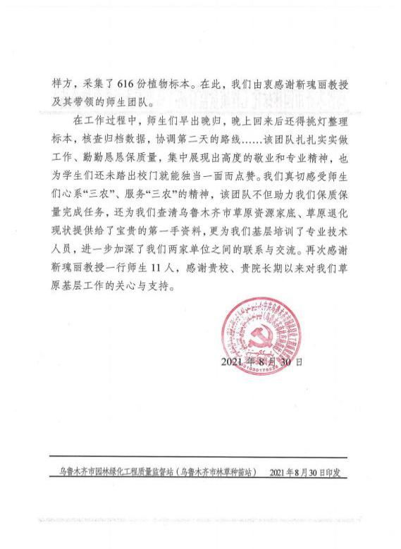 公共管理学院(法学院)“石榴红了”小分队在指导老师的带领下于2021年7月前往和田地区策勒县的8个乡镇,进行了为期一周的实地调研,梳理出了策勒县“党建+产业发展”、“党建+制度创新”、“党建+乡贤参与”等三种有效的贫困治理模式,为乡村振兴开展“党建+”治理模式提供了参考借鉴;经济与贸易学院农业考察小分队通过对国家现代农业示范区新疆昌吉州奇台县腰站子村实地考察,走访了农户30余户,考察了农业合作社及连片农田2000余亩,为农业现代化发展出谋划策;草业学院草地管理与牧草生产技术服务小分队协助乌鲁木齐市林业和草原局调查了23个乡镇、验证了931个点位、1221个样方,以及616份植物标本的采集工作,协助完成了乌鲁木齐市退化草地、草原资源的草地类型、草地生产力利用现状的调查,为乌市的草地生态修复工作提供了基础数据(图6)。